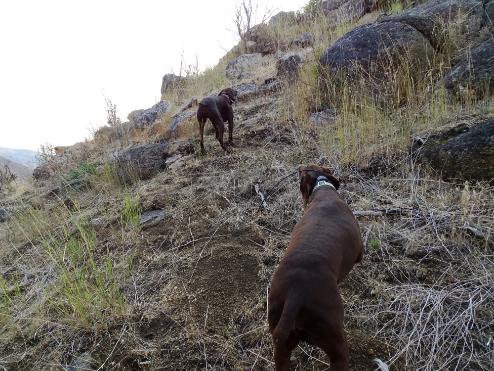 Jake honored as I picked my way through the rocks. Since my operation I don’t always lift my left leg as high as I think and the results aren’t pretty. The birds flushed and my back wasn’t going to let me swing in that direction. I was hoping for a straggler but it didn’t come. As usual, the dogs made a short chase and than came back to me with a look of discuss.