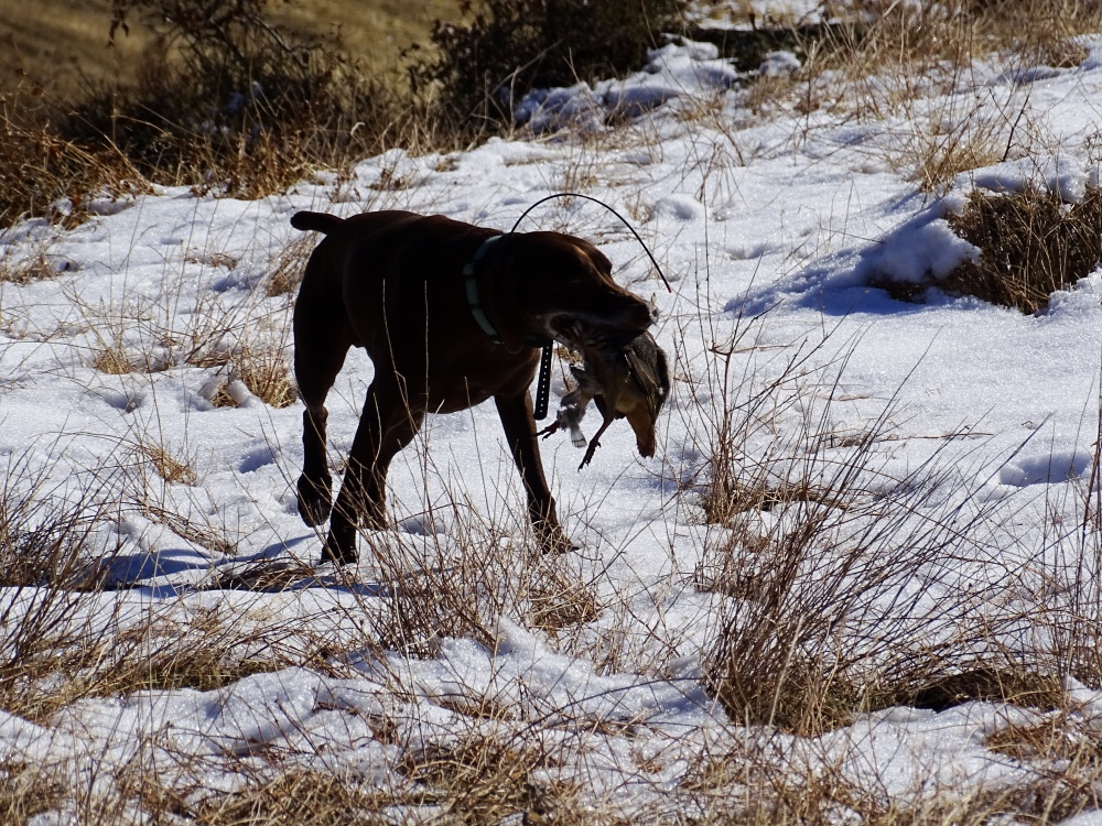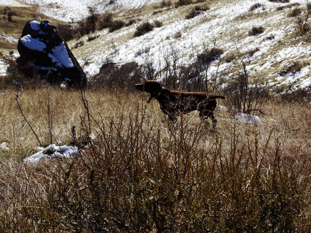 If there was anything wrong with the day, it had to be that the chukar scent carried so far with the breeze. There were several points where the birds were 100 yards away and they flushed out of range. Usually when Grady’s point is with a low tail they are off a way.