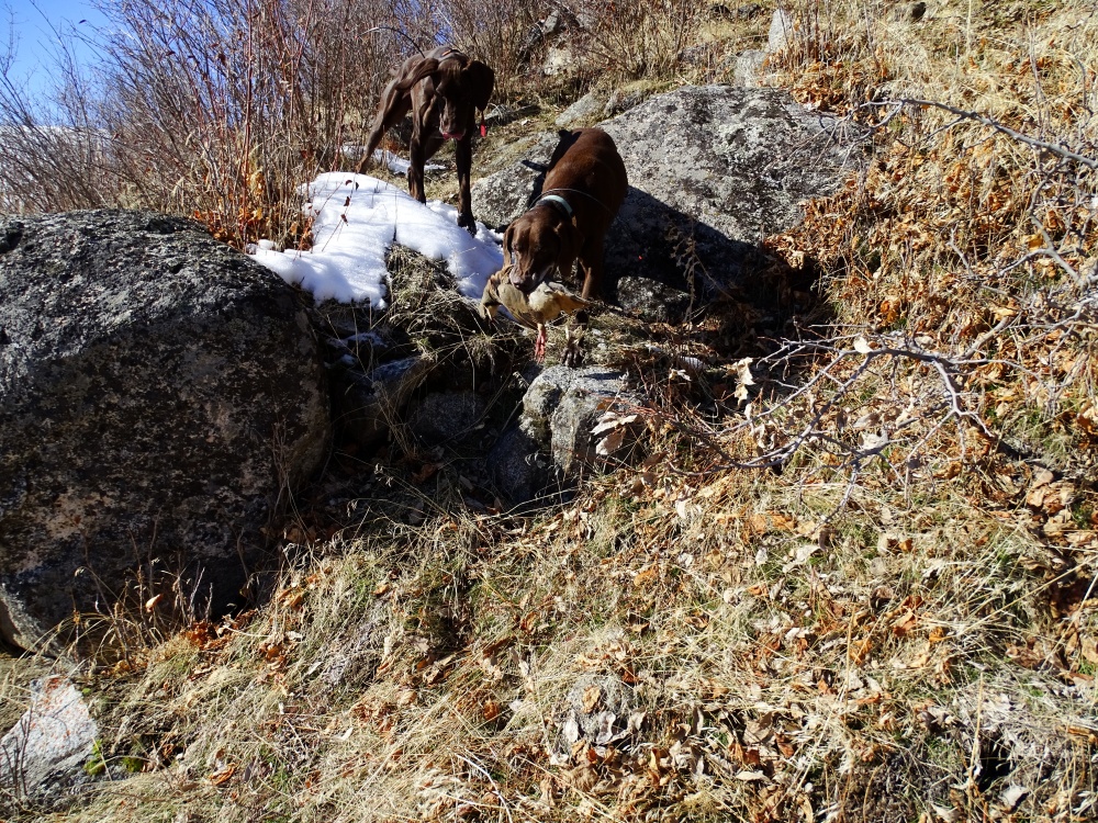 I don’t know how it could get much better than today. It was one of those hunts just for the exercise. Tomorrow’s the day with the back doctor, so I decided to get the dogs out and go as far as we could. The sun was shining and the temperature was 27 degrees with a slight breeze. The only question was whether I was man enough to get to where I could hear chukars talking right out of the truck.