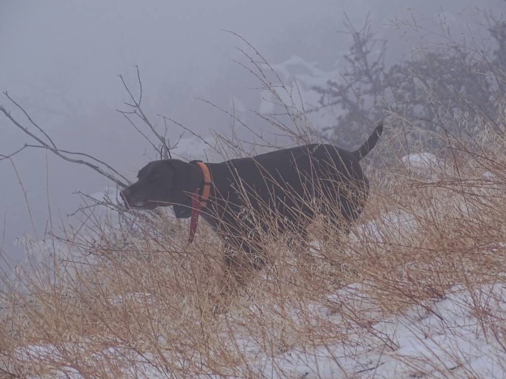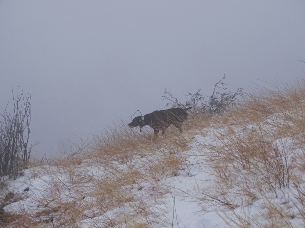 As I approached I wondered where the bird could be but reminded myself “trust your dog”. My footing was good as two chukars came out of the snow and flew to my right. They were maybe ten yards when they busted and flew the way I like to shoot. A gimme. Grady spent a long time in the fog looking for a bird that I surely shouldn’t have missed. But I did with both barrels. Shortly afterwards I jumped a single that I believe must have had a heart attack and Grady got to bring it uphill to me.