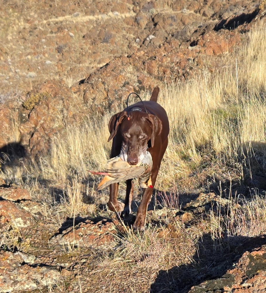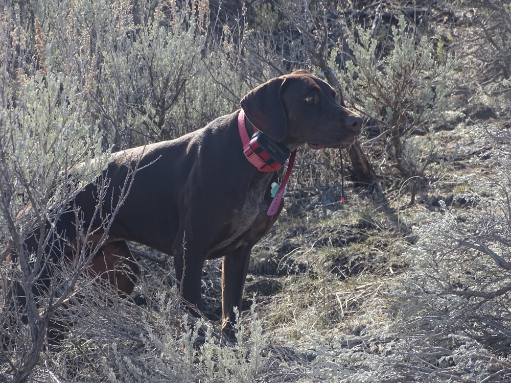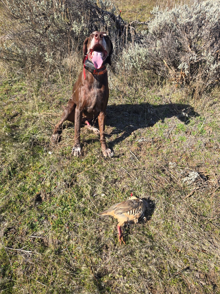 I had flushed a covey of chukar and missed. I watched the covey fly around the rim and was heading in the direction they flew. Knowing that Grady would probably head that way I moved on. After a couple of minutes of not seeing Grady, I looked at my Alpha and noticed he was down the hill a couple of hundred yards. Walking his way I finally saw him covering an area about the size of two football fields intensely. I watched him for a few minute and convinced him to come back where I was. I know that Grady, like my past dogs, had more trust in my shooting then I do and he probably figured I hit a bird. We started in the way I wanted to hunt and five minutes later my Alpha said Grady was back over in the same spot. I climbed up on a rock where I could see and Grady was still covering that area. Finally as Grady approached some cover a cripple tried to fly. Grady grabbed it and knew right where to come to get it to me. None of my dogs have ever held onto the bird until I took it from his mouth, but for some reason Grady likes it. Well this bird was the exception. When he got to me he dropped it like, I worked my butt off for this bird and you’ll have to pick it up yourself after you give me a drink.