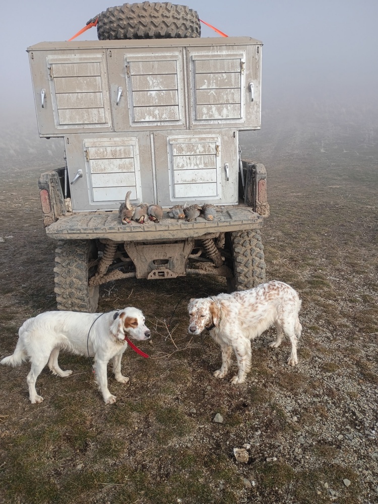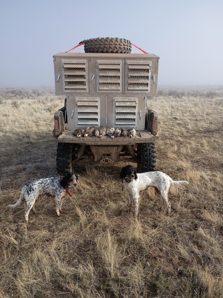 I’ve met Darin before, but never actually hunted with him. You might remember the post of me pulling him out of the mud a few years back. He’s obviously got this chukar hunting down. Thanks for keeping in touch and for the pictures, Darin. I don’t know this for a fact, but I’m guessing he also thinks that chukars are the best pointing dog birds on earth. I believe this whiter dog in the next picture is only nine months old. Gonna be a good one.