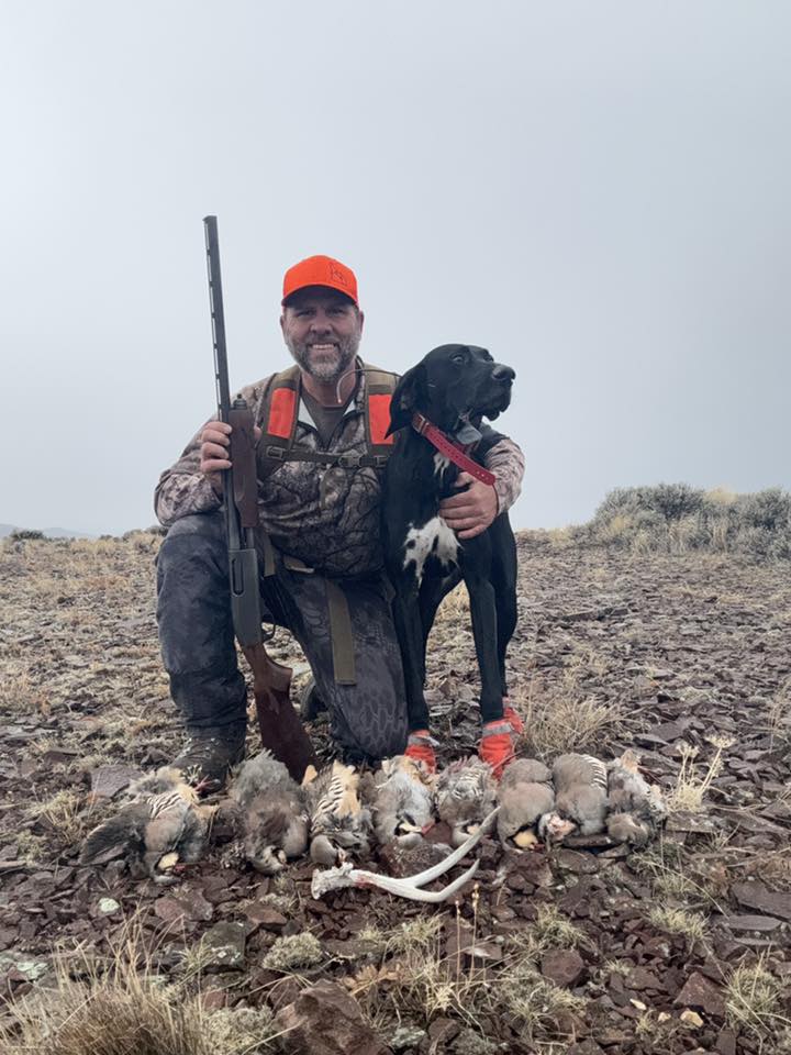 I know it’s too late for non-residents to take advantage of this late season in Idaho, but I just thought I’d pass these pictures on to show how it is. Here’s a picture of Dennis Stevenson and his dog Koebe with the birds he’s finding this winter.