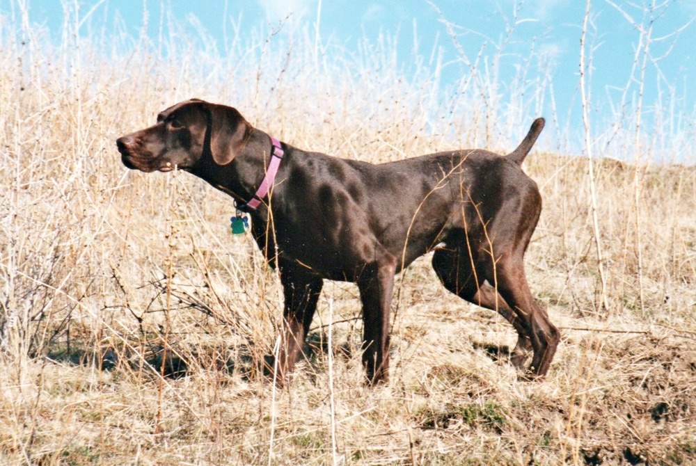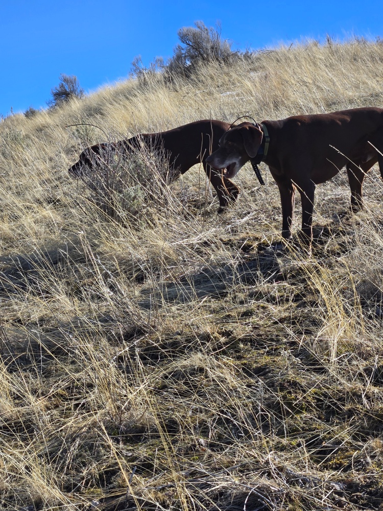 And our GSP mix, Alli. She was a rescue pup intended to be Doug’s hunting dog. Doug was still in high school, so you know who she ended up hunting with all the time. One particular hunt over at Brownlee reservoir, I was hunting with her. I had shot a few birds. and decided to film her for a while. Another hunter was on the hill and came over to me. He had heard me shooting and wondered if he could tag along and maybe get a chukar. I didn’t mind, but before I had my camera ready, I heard a chukar fly, and the guy shot. At first, I thought it was his Labrador screaming in pain. I soon realized it was Alli. Making this story short, I had to pack her 2 miles to the truck down a steep rocky ridge. At 85 pounds, it wasn’t an easy task, but she stayed motionless to help me keep from falling. Once again, I don’t recall the number of birds we got, but I remember the vet saying she had over 100 pellets in her, and if none were in vitals, she would come out of it fine. None were, and she did.