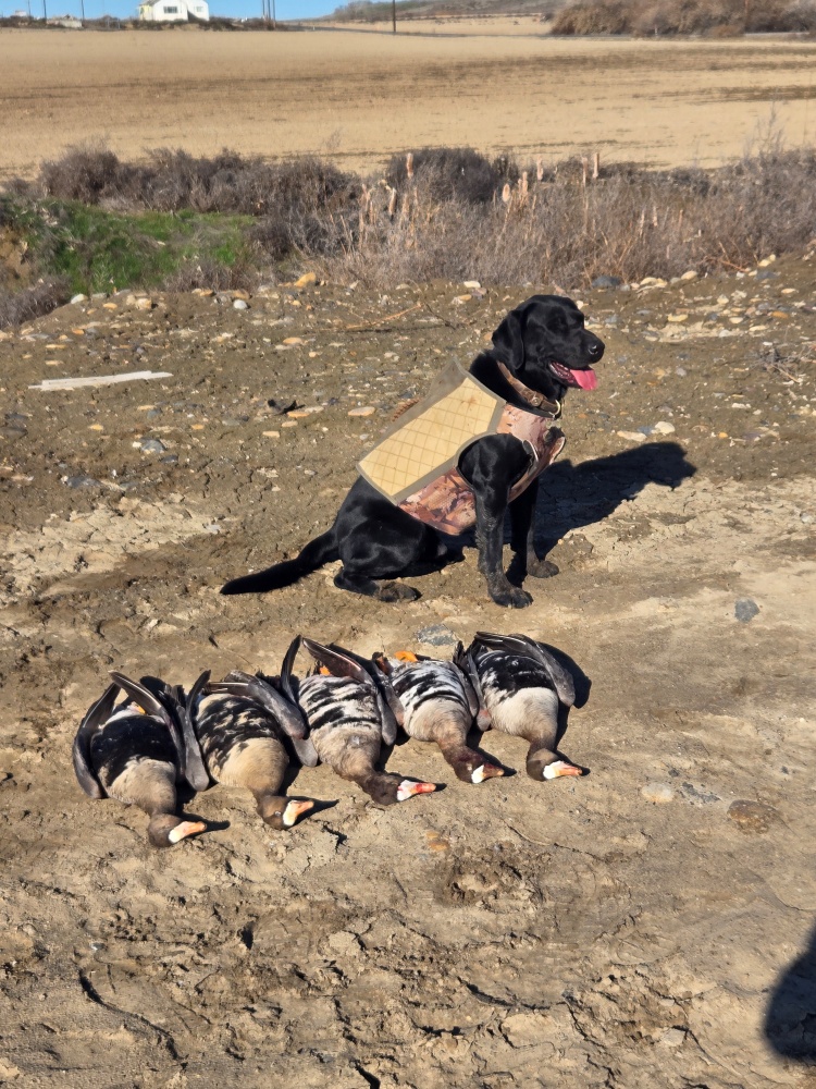 It was impressive to just watch him hide under the brush and not move a muscle. The only thing that moved was his eyes. All I had to do was watch his eyes, and I knew where the birds were. Just like a chukar dog on point, he seemed to know the importance of staying motionless. But once the shooting is over, he becomes a retrieving machine. There was one cripple that he chased for at least 200 yards. The speckled goose could fly just fast enough to keep out of the reach of Blaze’s jaws. The corrugated field gave the goose that edge. Finally, there was a cloud of dust, and Blaze was on his way back to the blind with the live goose.